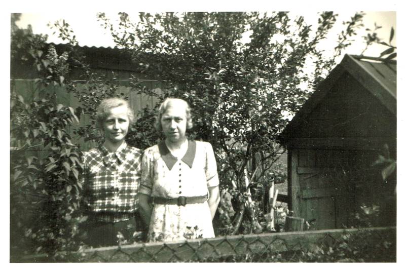 Links Trijntje Postma - Huisman. Rechts Aaltje van de Haar bij ons achter het huis Schipholtstraat 155. Archief Marloes Japink.