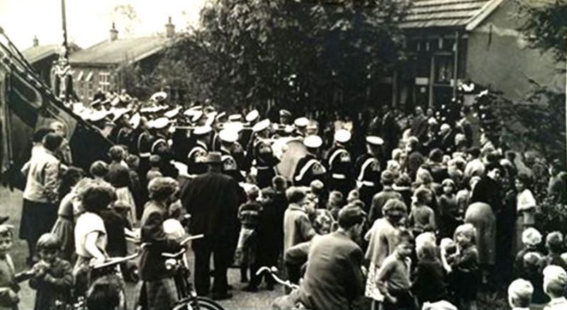 Bruidspaar Wolter Evers en Cobie van de Haar. Op de foto links het meisje is Alie ter Heide, daarachter Jans Lof - Boxem. Daarachter Hennie Röwer. Rechts Marietje ter Heide. Daarachter Riekie Belt met op de arm Jan Belt.Trouwdatem was 18 mei 1957. Het bord 'Hulde aan het Bruidspaar heb ik gemaakt. De dennetakken hebben we stiekem gehaald bij het Olafklooster in de Beekhoek. De foto is gemaakt door Bennie de Vries.