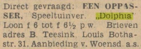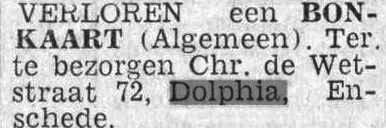 Door eenige personen bewoners van het Tuindorp ,,Dolphia" , was het initiatief genomen, om te komen tot de oprichting van een Buurtvereniging op nationalen grondslag. Na een korte voorbereiding kon men gisteravond in de zaal van cafe ,,Dolphia" de oprichtingsvergadering reeds houden. Na diverse besprekingen werd de vereeniging opgericht onder den naam: Nationale Buurtvereniging ,,Wilhelmina"voor 't Tuindorp ,, Dolphia"Het ledental dezer nieuwe vereniging verdraagt momenteel 41 gezinnen. Zaterdag a. s. houdt de vereniging den eersten fietstocht voor haar leden.