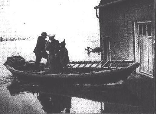 De oorlog heeft in ons land nog niet haar intrede gedaan. De spanningen waren er uiteraard wel. Voor de bewoners in het Rivierengebied waren het dubbele angstige tijden. Het was een barre winter in 1940. Deze foto toont dat het hoge water de dijken overstroomde met het daarbij het kruiend ijs. deze mensen, waaronder een kind waren naar de bovenverdieping gevlucht.. Het water stond al reeds tot aan de raamkozijnen gekropen. Militairen boden de helpende hand.