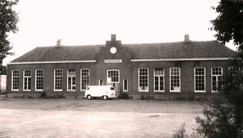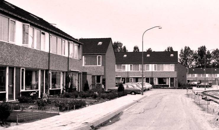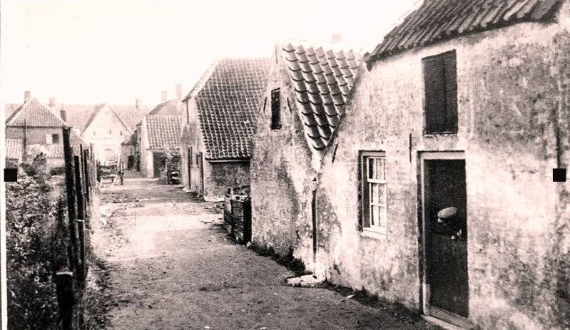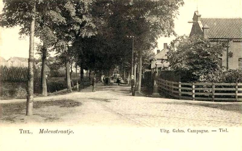 Molenstraat Tiel gezien vanaf het punt waar rechts A.H en links het pompstation. In de verte de achterkant van de woningen van de Dr. Bosstraat. Daarnaast de boerderij waarin in de jaren '70 de familie Vlastuin woonde. Waar de bonenstokken staan zijn in de jaren 90 van de 19e gebouwd.