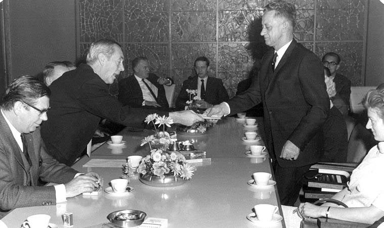 Afscheid van de heer Dirk Schoots. Schoots was afdelingsbaas in de forceerderij bij Daalderop. Hij had een geweldige kennis op gebied van forceren. Links de presidentdirecteur dhr. N. Daalderop.