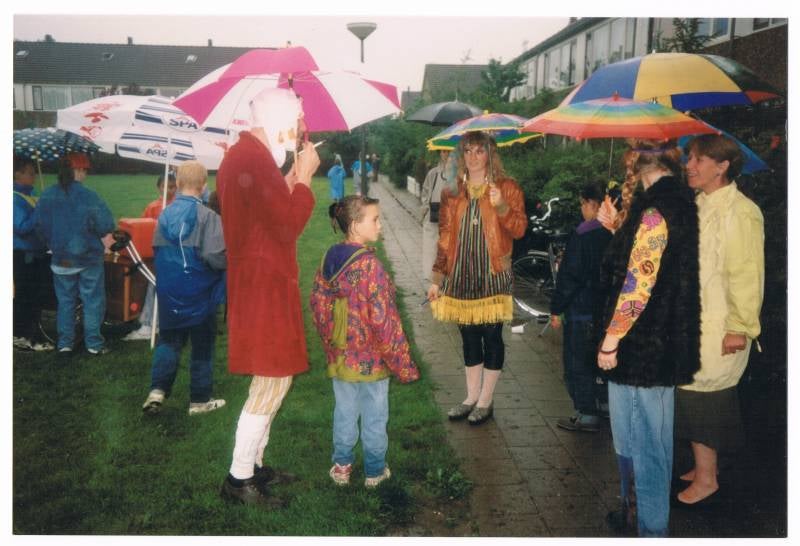 Wie herkent zich op deze foto. Het zijn scholieren die meewerken aan het dertigste Oogst en Fruitcorso in Tiel. Deze foto is gemaakt door de Telegraaf op 05 - 09 - 1990.