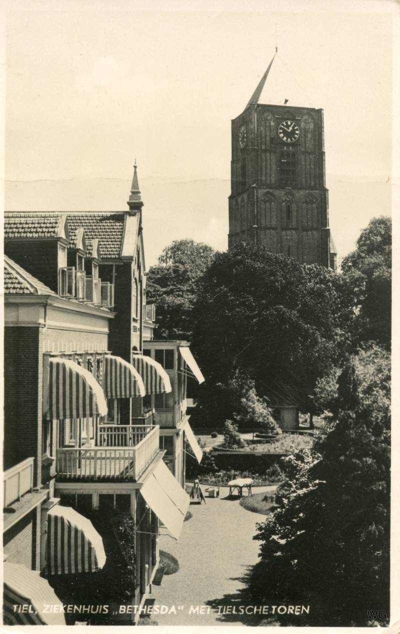 Links het oude Bethesdaziekenhuis. op de achtergrond de oude Sint Maartenskerk.
