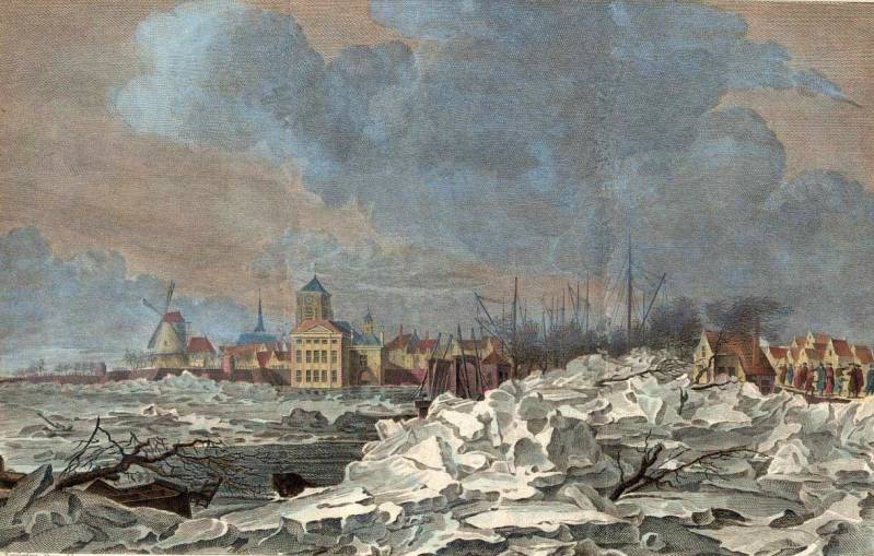 Kruiend ijs in de Waal voor de stad Tiel. 03 - 02 - 1799.