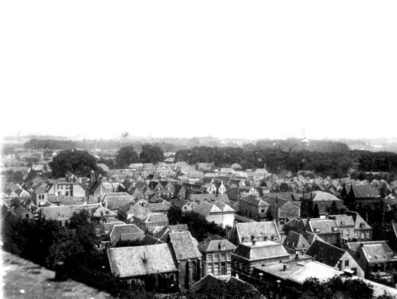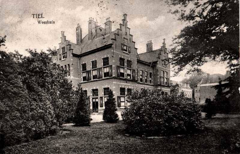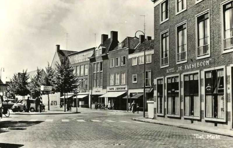 Fraaie opname van het oude Tiel. We kijken hier vanuit de Gasthuisstraat richting de Vleestraat.. Het oude gemeentehuis met het mooie torentje staat op de hoek van de Vleesstraat Kerkstraat.